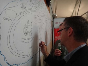 Our tagline for the evening was: Fuel your passion. Spark change. Ignite your thinking. And to facilitate this, we encouraged attendees to get involved in a bit of 'blue sky thinking' with Martin: What does the future of the Manawatu look like – no limits! We certainly got some interesting ideas, and it was great to see everyone engaging creatively! As the audience provided their ideas for the future, Martin drew these onto a large sheet of paper as the output was filmed and projected onto a large screen.